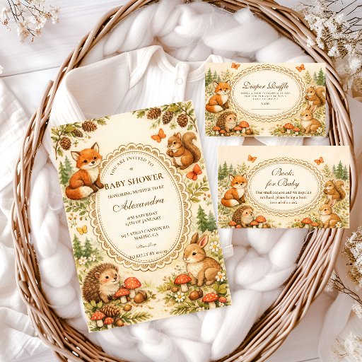 This charming woodland baby shower design features adorable forest animals gathered around a delicate vintage frame, creating a warm storybook scene perfect for celebrating a little one on the way. Sweet illustrations of a bunny, raccoon, squirrel, and owl are surrounded by tiny mushrooms, pinecones, wildflowers, and soft woodland greenery. The warm neutral palette and gentle watercolor style give the design a cozy, nostalgic nursery feel inspired by classic children’s book illustrations. Perfect for nature-themed baby showers, woodland celebrations, or rustic forest gatherings.