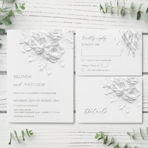 White 3D Flowers Roses Minimalist Wedding Invitati Kaart