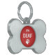 Eenvoudig rood en wit label voor dove huisdieren. "Ik ben doof"-tekst in het midden en een kleine witte pootdruk onderaan.