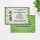 Schimmelachtig en vers kalkgroen en wit ontwerp met lichtstralen. Gebruik deze 2,5-inch x 3,5-inch (net iets groter dan een standaard visitekaartje) kaart voor al uw speciale evenementen en prestaties. Maak uw evenement verfijnder en gedenkelijker met professioneel gedrukte tickets. (zonder serienummers of perforaties). Ideaal voor sociale organisaties, schoolspelen, podiumkunsten, non-profitorganisaties, kleine bedrijven, sportevenementen en nog veel meer! Voer eenvoudig alle essentiële gegevens in en beveel snel uw eigen algemene toegangskaarten of toegangskaarten voor bezoekers. Eerder dan het gebruiken van generische genummerde scheur van kaartjes, gebruik deze en herinner uw patronen van de datum, de tijd en de plaats van uw gebeurtenis. Neem zelfs extra commentaar op de rug! Pas de achtergrondkleur aan door (na het ingaan van jouw tekst), klik "pas het aan", dan klik "geef"uit, dan "achtergrond", en kies van honderden unieke kleuren.