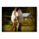 Een prachtige foto van een volledig kleurenportret van een wit paard. De fancy focus geeft de extra illusie van beweging terwijl het loopt met genade en kracht over een landelijk veld, met omheiningen en een schuurstructuur op de achtergrond enigszins buiten de focus. De staart en mane lijken te zwaaien in een rustig middagbriesje. Dit afbeelding past bij vele gelegenheden. Geef een object een persoonlijk tintje met je eigen tekst om een uniek paardengeschenk te creëer voor het paardenliefhebber of de paardenrenner.
