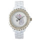 Een grillig horloge met een eenhoornthema met een witte band en sprankelende details. De hoogtepunten zijn het ingewikkelde ontwerp en levendige kleuren, terwijl zachte, diffuse verlichting de charme ervan verbetert.