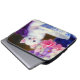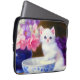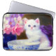 Laptophoes met een mooie witte kitten met een paars lintje! Dit vloeiende kat vormt naast een blauwe kom en een vaas van roze, paarse en witte bloemen. Een geweldig cadeau voor kattenliefhebbers en Victoriaans kunstliefhebbers!