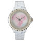 Een elegant polshorloge met delicaat geverfde witte kant tegen een waterkleurig visueel vlak.
