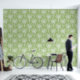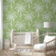 A symmetrical palm tree pattern featuring white etched-style palms set against a soft green background. The arch-like layout and subtle hand-drawn texture give the design a breezy, relaxed feel.