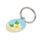 Destei's afbeelding van een witte frangipani-plumeriebloem met groene bladeren. De achtergrondkleur is blauw met zandtextuur op de bodem. Op de rug zijn er personalizable tekstgebieden voor de naam van het gezelschapsdier en voor een telefoonaantal.