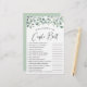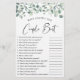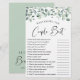 Vrijgezellenfeest "wie kent het paar beste" spelblad met elegante groene eucalyptus greenery waterverven en een stijlvol script. Pas de vragen aan en voeg op de achterkant de naam van de bruid-aan-zijn en de doucheclide toe.