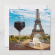 Glas wijn met brieskaas op de Eiffeltoren en de skyline-achtergrond van Parijs. Zonneachtig uitzicht van glas rode wijn dat de Eiffeltoren in Parijs over het hoofd ziet