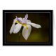 Doorden van recente regenval rusten op blaadjes van mooie witte, wilde orchidee. De ventilator staat uit tegen donkerbruine en groene kleuren van de achtergrond. Deze lege notitiekaart is klaar om met uw eigen tekst te worden aangepast. Selecteer verscheidene van deze lege notitiekaarten en geef in een reeks als gift. Kan ook als regelmatig 5x7 wenskaart worden bevolen.