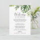 Deze wilde tropische palmwelkomstbriefjes en kaartjes zijn perfect voor een welkomsttas van een doelbruiloft. Het ontwerp is voorzien van een exotische reeks groene waterverf banaanpalmbladeren, kannen, bladeren, bladeren, bladeren, botanische planten en groen voor een tropische zomer. De voorzijde van de kaart is voorzien van een welkome brief en een reisroute. Voeg een kaart van uw toevluchtsoord toe met de belangrijkste locaties die op de achterzijde van de kaart zijn vermeld.