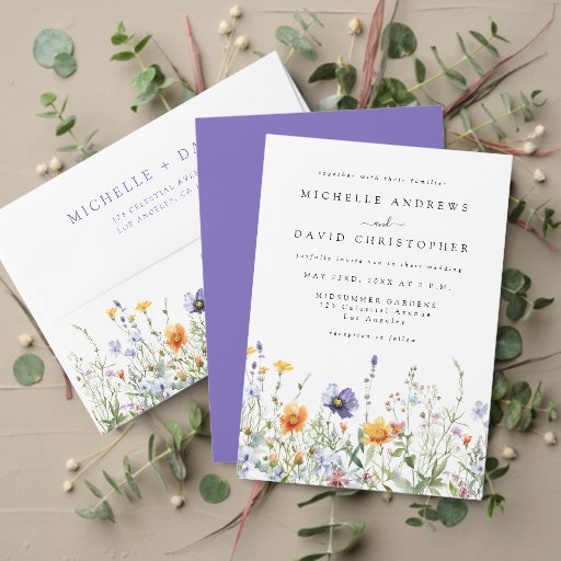 Dit speelse ontwerp bevat een rij levendige, meerkleurige wilde bloemen. Perfect voor een informele, outdoor, en voorjaars- en zomerbruiloften.