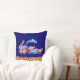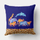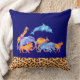 Een kussen ontworpen met een exotische oranje gekleurde luipaard print rand langs de onderkant. Geïllustreerd met een digitaal waterverf afbeelding van een kudde wilde diertjes die samen lopen. Dieren zijn onder andere een springende dolfijn, een giraffe, een olifant, een kangoeroe, een neushoorn, een leeuw en een luipaard. De achtergrond is een blauwachtig paarse kleur.