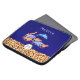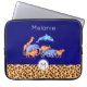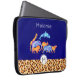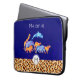 Laptophoes die zijn ontworpen met een exotische oranje rand voor het afdrukken van luipaarden langs de onderkant. Voorbeeld met een digitaal waterverf afbeelding van een kudde wilde dieren die samen lopen. De dieren zijn onder meer een springdolfijn, een giraffe, een olifant, een kangoeroe, een rhino, een leeuw en een luipaard. De achtergrond is een blauwige paarse kleur.