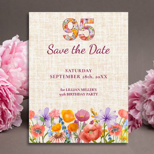 Celebrate her 95th with this floral number wildflower invitation. A soft linen background, large “95” filled with watercolor flowers and a flowing script name create an elegant botanical look for a special ninety fifth birthday. Personalize the wording, date, venue and RSVP to invite family and friends to this beautiful milestone celebration. Enjoy!