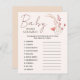 Voeg gelach en speelsheid toe aan je Baby shower met ons 'Wildflower Boho Baby shower Word Scramble Game!' De gasten zullen veel plezier hebben bij het invullen van de lijst met woorden op deze kaart, allemaal gerelateerd aan baby's, die ze als eerste kunnen ontwarren! Haal de jouwe vandaag en creëer onvergetelijke herinneringen! Oplossing: 1. formule 2.pacifer 3.baby monitor 4.schommelstoel 5.swaddle 6.luier raffle 7.rubber ducky 8.kinderwagen 9.playpen 10.eosines