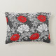 Accent kussen in een William Morris, Art Nouveau, bloemletterdruk van gestileerde chrysanthema's, digitaal versterkt en gekleurd, in tinten van zilvergrijs/grijs en wit, voorzien van diep rood, op een donkergrafietgrijze achtergrond
