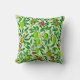 Gooi kussen in een William Morris Art Nieuw patroon van ledematen, granaatappels en perziken, met bloesems, op bladtakken - vruchten in kalkgroen en koraal sinaasappel, met groene bladeren, tegen een gepatenteerde, kalkgroene en witte achtergrond