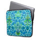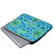 Neopreen-sleeve in een William Morris-patroon van hyacinten, tulpen en bladeren, in tinten van diep keruleaans en kobalt blauw, voorzien van een jus, geel en kalkgroen, op een pastelblauwe achtergrond