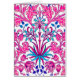Notitiekaart in een William Morris-patroon van hyacinten, tulpen en bladeren, in tinten van fuchsie en zacht roze, voorzien van donkerblauw en turquoise, op een witte achtergrond