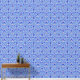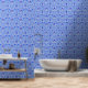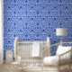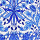 Behang in een William Morris-patroon van hyacinten, tulpen en bladeren, in tinten van kobalt en ceruleenblauw, geaccentueerd met dark navy, op een witte achtergrond