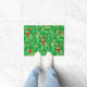 Doormat in een William Morris Art Nieuwe textielpatroon van lychee-boomtakken en -bladeren, in tinten van limoen en diepgroen, voorzien van rode lychee-vruchten en gele bloesems op een lichtgroene achtergrond