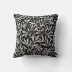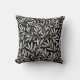 Gooi kussen in een William Morris Art Nouveau textielpatroon van gestileerde wilgentakken en bladeren in tinten van zilvergrijs / grijs en wit, op een zwarte achtergrond