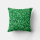 Drog kussen in een William Morris Art Nieuwe textielpatroon van gestileerde wilde takken en bladeren in tinten groen, voorzien van wit, licht kalkgroen, op een donkergroene achtergrond van smaragd/pijngroen