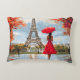Een sierlijke vrouw met een rode paraplu loopt in een zacht herfstbriesje richting de Eiffeltoren. Romantische Parijse charme in gloeiende rode en gouden tinten.