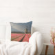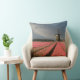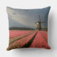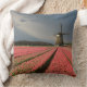 Foto gooit kussen met een landschap met een windmolen en roze tulpbloemen in rijen op een bolvormig boerderij onder een grijze hemel op het platteland in Nederland in het voorjaar.