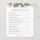 Wie kent de Paar Best? Vrijgezellenfeest spelkaart met een waterverf-cascade van wintergroen.