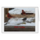 Natuur wilde vogelfotografie, van twee mannelijke Noordelijke Kardinalen en een zwarte Junco-voeding op de sneeuwgrond, en een wintergroet en deze kaart - leeg binnenin voor je eigen persoonlijke boodschap.