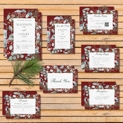 Announce your winter wedding with a touch of frosty elegance. Our enchanting dinner response card with QR code features a captivating watercolor scene. Crisp pine branches and fragrant eucalyptus mingle with vibrant red rose hips and deep blue berries, all nestled amongst lush green foliage. The design stands out against a backdrop of rich holiday red. Your wedding details are showcased in a crisp white text box, framed by a delicate gold outline frame that adds a touch of whimsy. This captivating design captures the beauty of a winter landscape, creating a truly unforgettable way to celebrate your love story. Created by Simply Farmhouse Press.