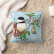 Schattigee Chickadee zittend op een boomtak in de winter met sneeuwvlokken vallen overal rond. Kerstversieringen hangen aan de boomtak waar de kikkervisje op zit.