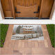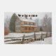 The perfect doormat for your country home or cabin. Photo of a beautiful log cabin, pine trees, fallen snow and rustic split rail fence.