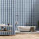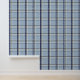 A plaid tartan pattern in calming muted neutral colors. Stripes in yellow, gray, white, and navy blue are arranged on a slate blue-gray background.