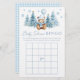 Sophisticated classic "Bingo" spel ontworpen voor een baby boy shower, versierd met een charmante teddybeer met schattig blauw pet en sjaal, met een blauw ballon, omgeven door winterpijnbomen en sneeuwvlokken en baby blauw gingham patroon aan de achterkant. Betrek uw gasten met dit heerlijke spel, perfect voor het toevoegen van plezier en opwinding aan uw winterfeest terwijl u gekoesterde herinneringen creëert.