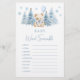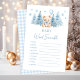 Elegant en verfijnd "Baby woord kluwen" spel, ontworpen voor een winterthema baby boy shower. Met een charmante teddybeer die een leuk strikje draagt en een blauwe ballon vasthoudt, omringd door winterdennenbomen en sneeuwvlokken en een babyblauw geruit patroon op de achtergrond, voegt dit klassieke spel een vleugje tijdloze stijl en plezier toe aan uw evenement. Perfect voor het entertainen van gasten en het creëren van gekoesterde herinneringen, het is een ideale aanvulling op een zoete en nette baby shower viering.
