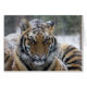 Een met sneeuw bedekte tijger kijkt in de verte.