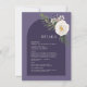 Prachtige witte florale met groen, geplaatst over een rijke paarse achtergrond, in een minimalistisch ontwerp... met uw gebeurtenisdetails in modern manuscript en klassieke doopvont, plaats binnen een diepere paarse boog. Eenvoudig. Elegant. Ideaal voor een winterbruiloft.