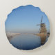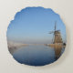 In de winter gooien ronde foto's kussens met een landschap op het platteland in Nederland met een windmolen, ijs op de rivier en vorst onder een heldere blauwe hemel.