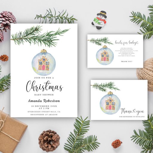 Wintertak met een speelgoed. Waterverf baby shower uitnodiging met kerstgrenen tak met Nieuwjaar speelgoed ballen in een peperkoekenhuis. Overeenkomende objecten beschikbaar.