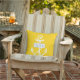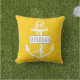 Wit anker en lijst met jouw naam geel nautisch omkeerbaar buitenkussen. Het heeft een wit anker op geel en jouw naam in een lijst. De achterkant is gemaakt van een geel en wit gestreept patroon.