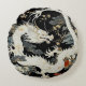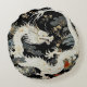 Dit ronde kussen heeft een witte Aziatische stijl draak en pijnboomtakken op een zwarte achtergrond.