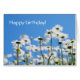 Witte madeliefjes in het veld aan de voorzijde van de blauwe hemel