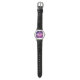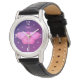 Witchy mot horloge in paarse en roze met magisch hekserig patroon van een gele mot in de nacht met halve maan en sterren erboven op donkere paarse achtergrond.