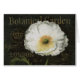 © Daphne Brissonnet / Wilde Apple. Een afbeelding van een witte bloem in vol bloei met zijn stengel en bladeren. Op het afbeelding zijn ook de woorden botanische tuin geschreven in goud en een barstende zwarte achtergrond te zien.