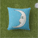 Dit decoratieve kussen in outdoor stof is een heldere aqua blauwe kleur bedekt met kleine witte open sterren met een witte halve maan met een gezicht en zwarte lippen in het midden op de voor- en achterkant.
