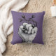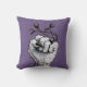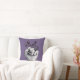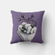 Witte hand kussen met een inkttekening die een hand in de vuist toont met scherpe zwarte nagels en een zwarte ring met kwaadaardige monsters met scherpe tanden over de paarse achtergrond. Een vage, griezelige illustratie met een gotisch gevoel.