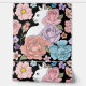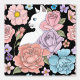 Een profiel van een witte kat met roze, blauw, lavendel en perzikkleurige rozen in een achtergrond van zwart