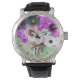Elegant bloemhorloge, paarse witte rozen en blauwe anemonen op een blauwgroen achtergrond met bedrukte roze edelstenen.